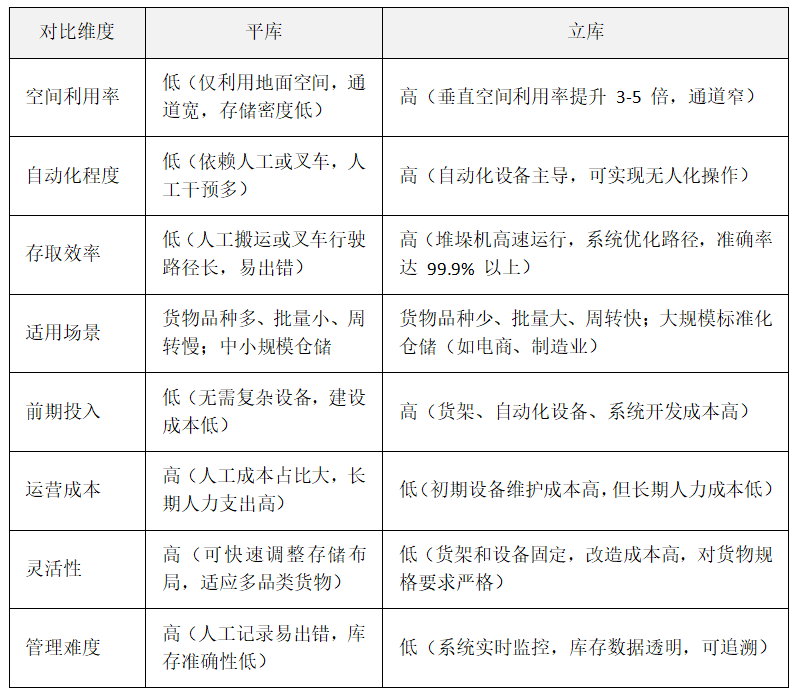 平庫(平面?zhèn)}庫)和立庫(立體倉庫,又稱自動化立體倉庫)是兩種常見的倉儲形式,在存儲方式、空間利用、效率等方面存在顯著差異。以下從多個維度詳細(xì)對比兩者的區(qū)別: